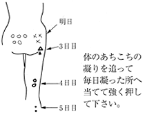 .貼り終わったら再度、先ほどの痛みを感じる姿勢をとってください。軽くなっていませんか?まだ痛みを感じるのは、1センチくらい違う箇所の痛みです。次男坊、三男坊と痛みの順番で気付きますので、その場で3回はその箇所へ貼り増してください。